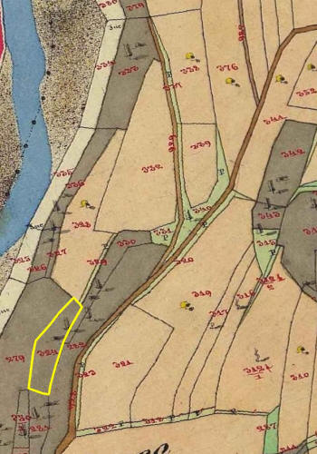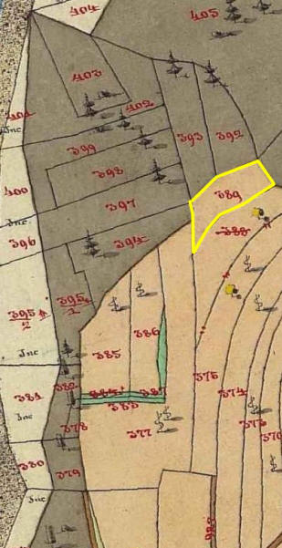 Nel 1817 è citato come confine sud nell'atto di acquisto del bosco p.f. 392 e 393. Giacomo fu Giuseppe muore nel 1825 e il terreno rimarrà degli eredi indiviso per dieci anni. Quindi nel 1834 perverrà assieme al bosco p.f. 393 al figlio Giacomo. | |||